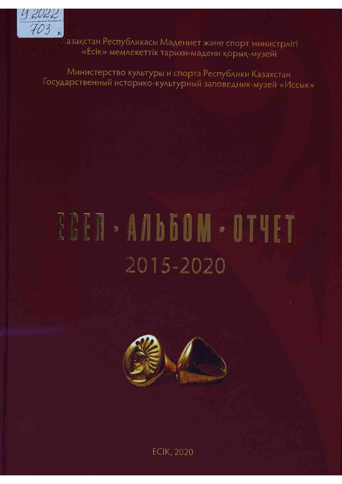 "Есік" мемлекеттік тарихи-мәдени қорық-музейі = Государственный историко-культурный заповедник-музей "Иссык" [Мәтін] : есеп албом : 2015-2020 / ; Қазақстан Республикасы Мәдениет және спорт министрлігі ; "Есік" мемлекеттік тарихи-мәдени қорық-музейі ; [алғы сөзін жазған Г. Р. Мухтарова, бас редактор Г. Р. Мухтарова ; жауапты редакторлар: Г. Р. Мухтарова, Л. Н. Плетникова ; орыс тілінен аударған С. С. Даутова]. – 2-шығ. .. – Есік : [б. ж.], 2020. - 245 б. , суретті; - Мұқабада кітаптың атауы: Есеп альбом. - Мәтін қазақ, орыс тілдерінде . . – 500 дана – ISBN 978-9965-23-581-8 (мұқ.) : 0 тг.