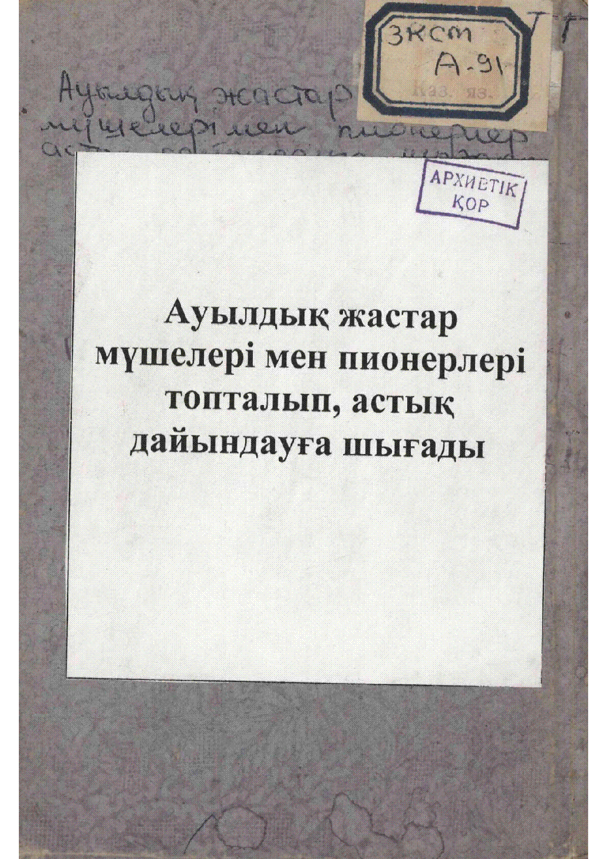 Ауылдық жастар мүшелері мен пионерлері топталып, астық дайындауға шығады = اۋىلدىق جاستار مۇشەلەرى مەن پىيانەرلەرى توبتانىب، استىق دايىنداۋعا شىعادى [Мәтін] / ... – Алматы : Тип. КЦСНХ №1, Ш.ж.б.. - 7 б.– (Алматы округтік жастар комитеті. - Мәтін араб графикасымен жазылған. . . : 400 дана