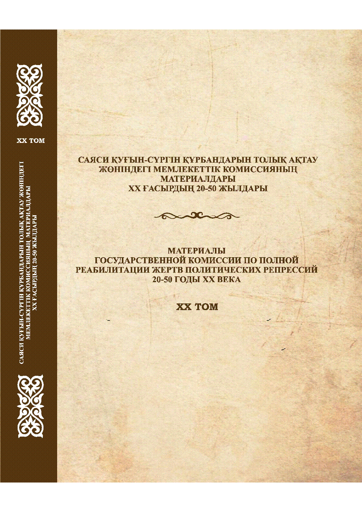 Саяси қуғын-сүргін құрбандарын толық ақтау жөніндегі Мемлекеттік комиссияның материалдары (ХХ ғасырдың 20-50 жылдары) [Мәтін] ; [жалпы ред. басқ. Е. Т. Қарин ; ред. алқа: С. Нұрбек [ж. б.] ; томның ред. алқасы: Ш. З. Байбеков [ж. б.] ; құраст.: М. И. Перебеева [ж. б.] ; Ш. Ш. Уәлиханов атын. Тарих және этнология ин-ты ; Саяси қуғын-сүргін құрбандарын толық ақтау жөніндегі Мем. комиссияның Жобалық офисі] .- Астана : [б. ж.] , 2022.– 1000 дана . – ISBN 978-601-08-1005-1 (мұқ.) - Қазақстан Республикасының Мәдениет және спорт министрлігі "Мәдениет және өнер саласындағы бәсекелестікті жоғарылату, қазақстандық мәдени мұраны сақтау, зерделеу мен насихаттау және архив ісінің іске асырылу тиімділігін арттыру" бағдарламасының "Әдебиеттің әлеуметтік маңызды түрлерін сатып алу, басып шығару және тарату" кіші бағдарламасы бойынша жарық көрді. - Мәтіні қаз., орыс тілд. . 20-том . Абай облысында кеңестік қуғын-сүргін зобалаңы (архивтік құжаттар жинағы)– 415 б. (мұқ.) : 0 тг.