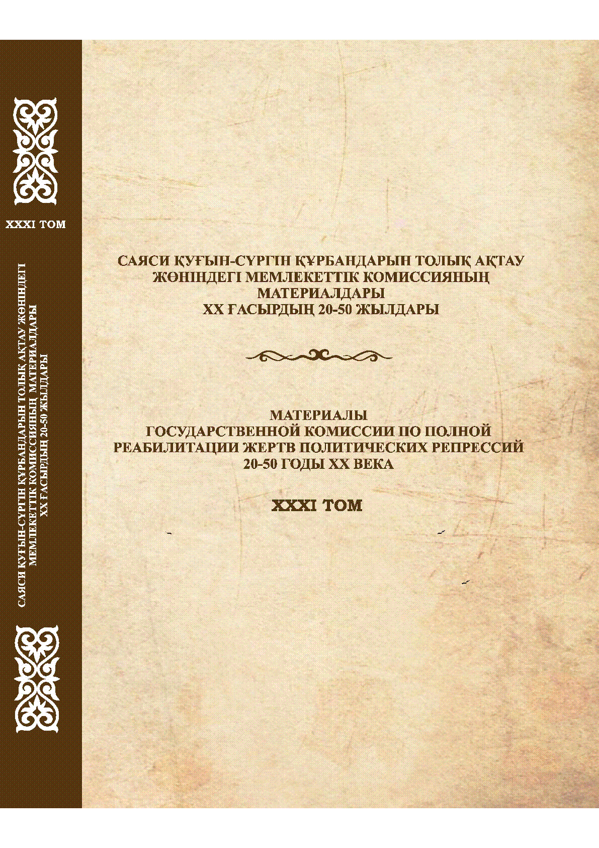 Саяси қуғын-сүргін құрбандарын толық ақтау жөніндегі Мемлекеттік комиссияның материалдары (ХХ ғасырдың 20-50 жылдары) [Текст] : монография / С. А. Жакишева ; [под общ. ред. Е. Т. Карина ; редкол.: С. Нұрбек [и др.] ; Ин-т истории и этнологии им. Ч. Ч. Валиханова ; Проектный офис Гос. комиссии по полной реабилитации жертв полит. репрессий] .- Астана : [б. и.] , 2022.– 1000 экз. . – ISBN 978-601-08-1009-9 (в пер.) - Текст на рус., каз. . Библиогр.: с. 118-127 Т. 31 . Конфискация байских хозяйств в Казахстане на рубеже 20–30-х гг. ХХ в– 175 с. (в пер.) : 0 тг.