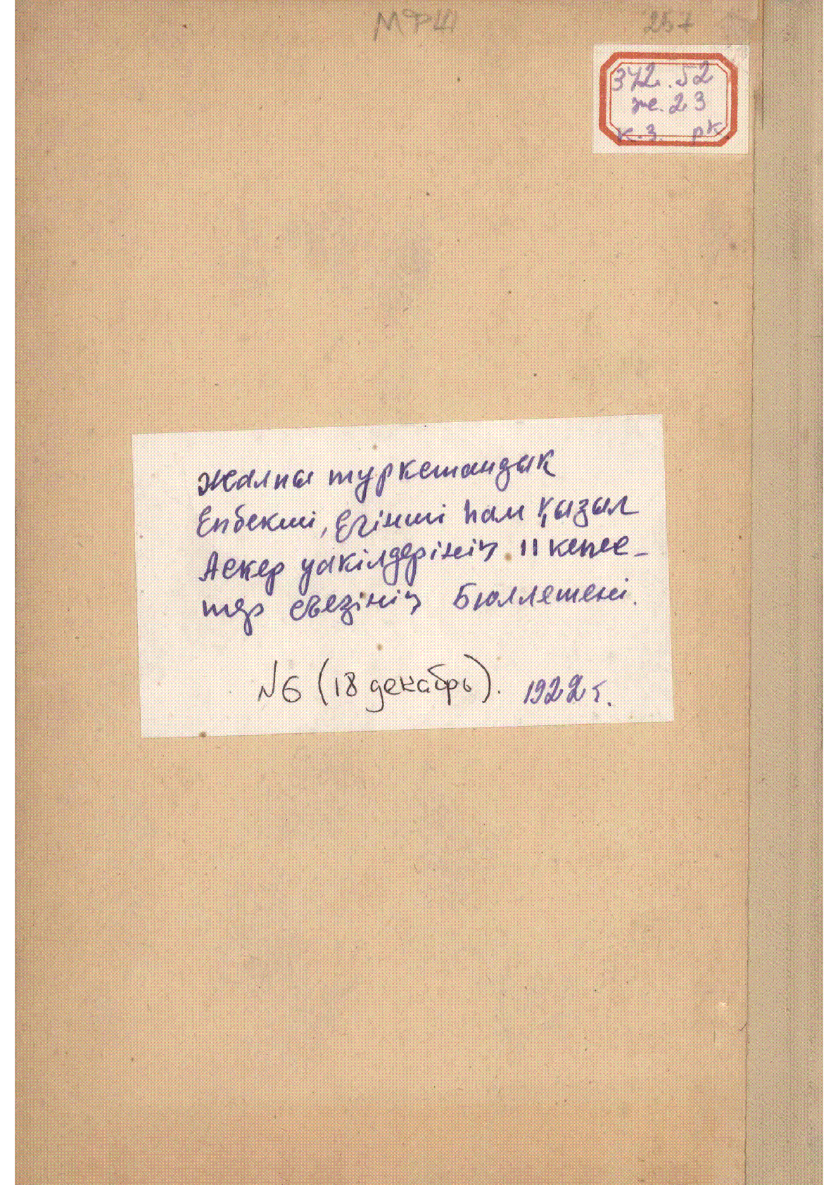 Жалпы Түркістандық еңбекші, егінші hәм қызыл әскер өкілдерінің ІІ-кеңестері съезінің бюллетені [Мәтін] : №6 (18 декабрь) / ... – Ташкент : Түркістан мемлекет баспасы, 1922. - 28 б. 26 см - Мәтін араб графикасымен жазылған . . – 2000 дана