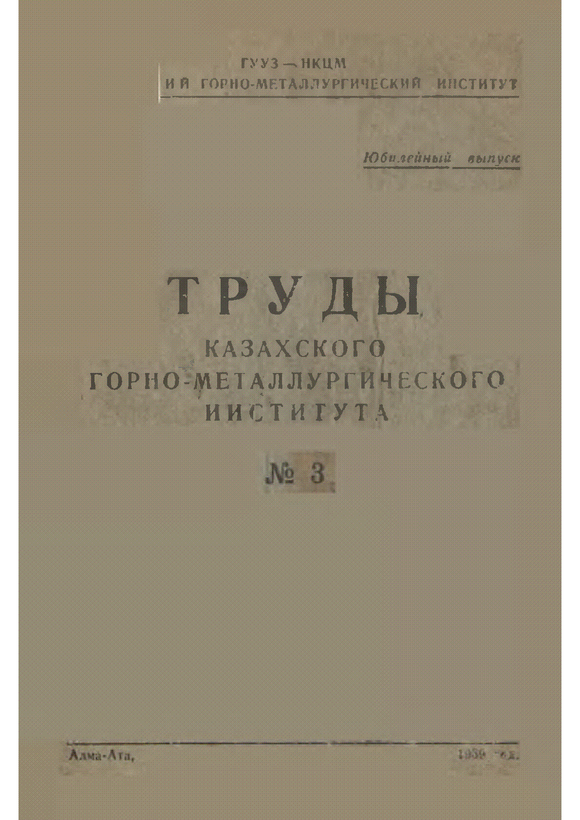 Труды казахского горно-металлургического института [Текст] : юбилейный выпуск / ; [ред. совет: А. И. Коктов [и др.] ; техн. ред. Г. В. Таратин] ; Каз. горно-металлург. ин-т... – Алма-Ата : [б. и.], 1939. - 172, [2] c.– (Труды казахского горно-металлургического института. ; № 3 . – Библиогр.: с.173 . – 350 экз.