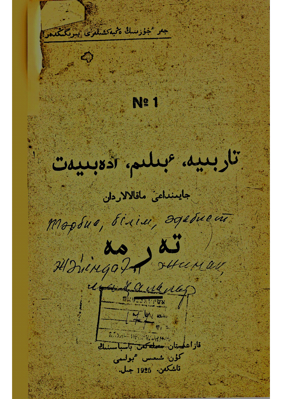 Тәрбие, білім, әдебиет жайындағы жинақ-мақалалар [Мәтін] - Ташкент : Қазақстан мемлекет баспасының күншығыс бөлімі , 1925.– [т. ж.] . - Мәтін араб қарпімен қазақ тілінде . № 1 .– 143 б.