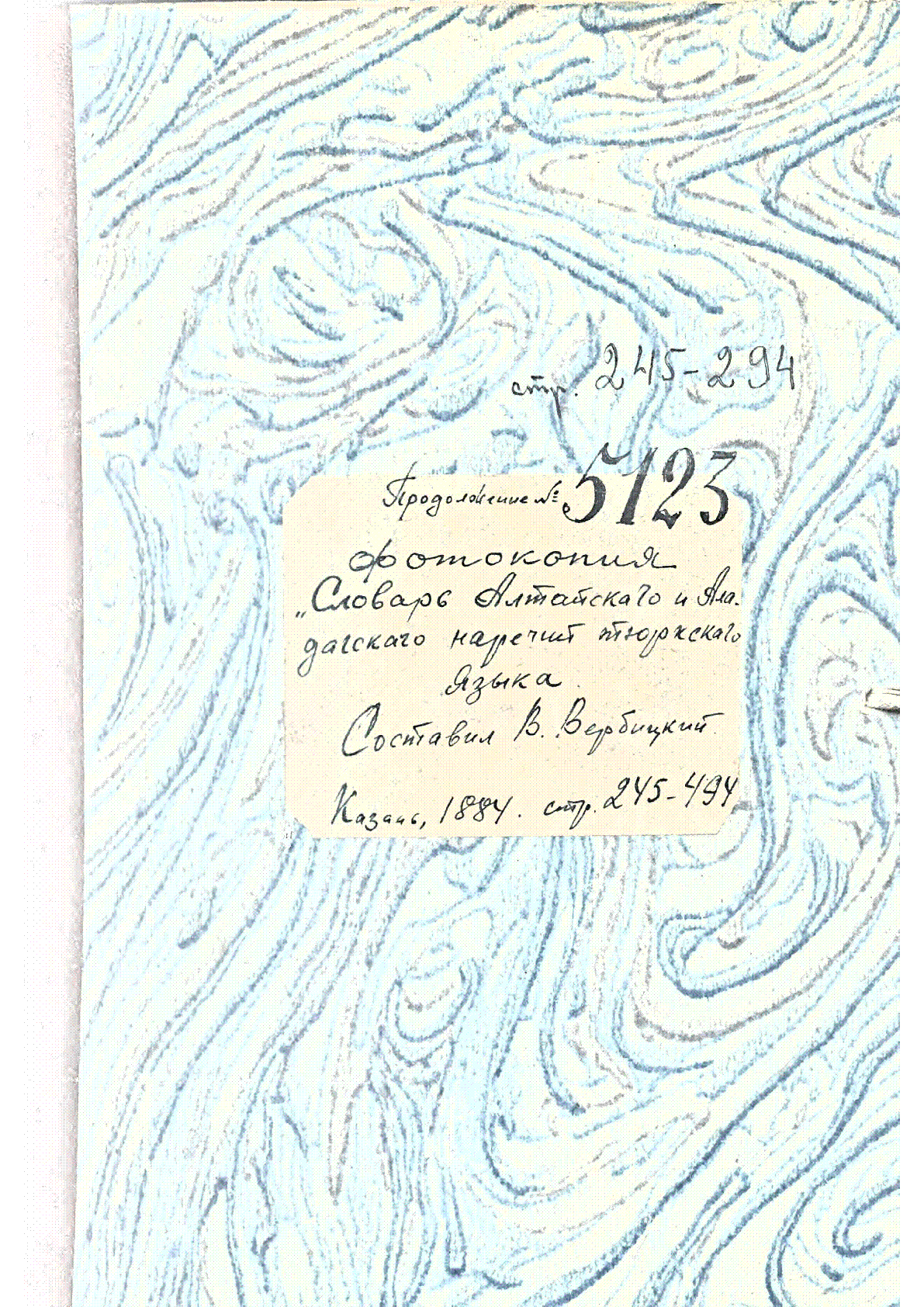 Словарь Алтайского и Аладагского наречий тюркского языка [Рукопись] : фотокопия / В. И. Вербицкий ; [составил В. Вербицкий]... – Казань : [б. и.], 1884. - 245-494 с. - В рукопись вошли фотокопии страниц с 245 по 494 . . – [б. т.]