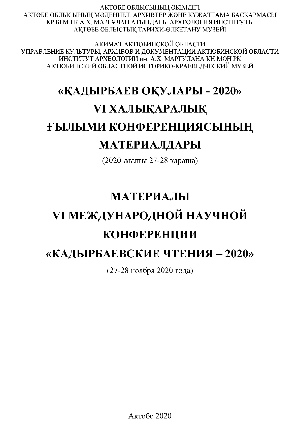 Мамиров , Т. Б. Памятники эпохи неолита у родника Толеубулак и в верховьях реки Эмба [Текст] / Т. Б. Мамиров , Ж. К. Таймагабетов , Д. А. Байтлеу [и др.] // Кадырбаевские чтения – 2020: материалы VI международной научной конференции, (Актобе, 27-28 ноября, 2020 г.) . - 2020. - Актобе. - С. 68-74. - Библиогр.: с. 71 ISSN<br>