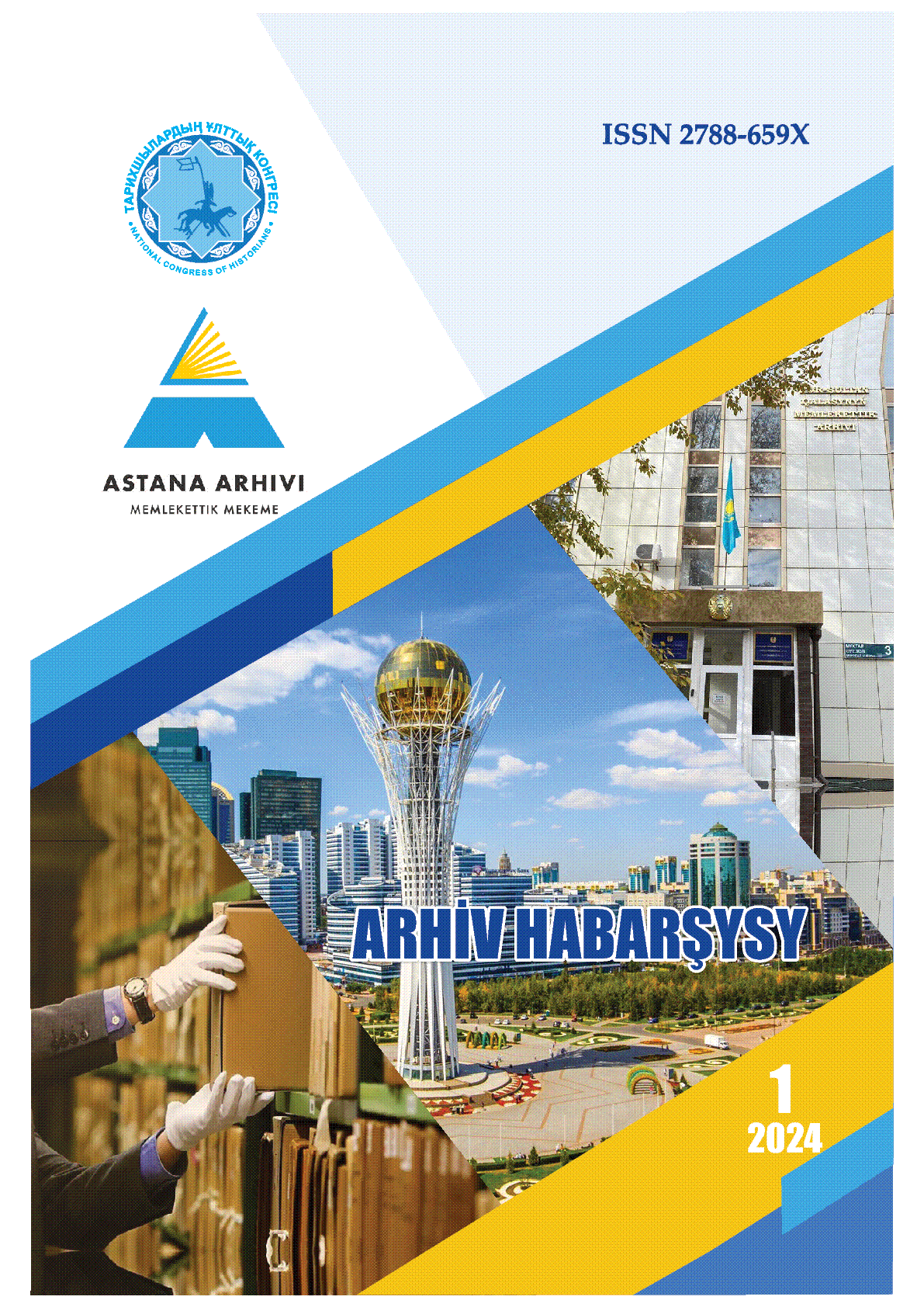 Архив хабаршысы [Мәтін] : ғылыми-көшілік, ақпараттық-әдістемелік журнал ; [«Астана қаласының мемлекеттік архиві» мемлекеттік мекемесі ; бас редакторы Ж. Б. Бимолдин ; редакциялық кеңес мүшелері : С. З. Есіркеп, Е. Б. Сыдықов, Т. Ә. Қышқашбаев]. – Астана : [б. ж.], 2024. - .– [т. ж.].– тоқсан сайын шығады. – ISSN 2788-659Х. 2024, № 1 (13). - [т. ж.]