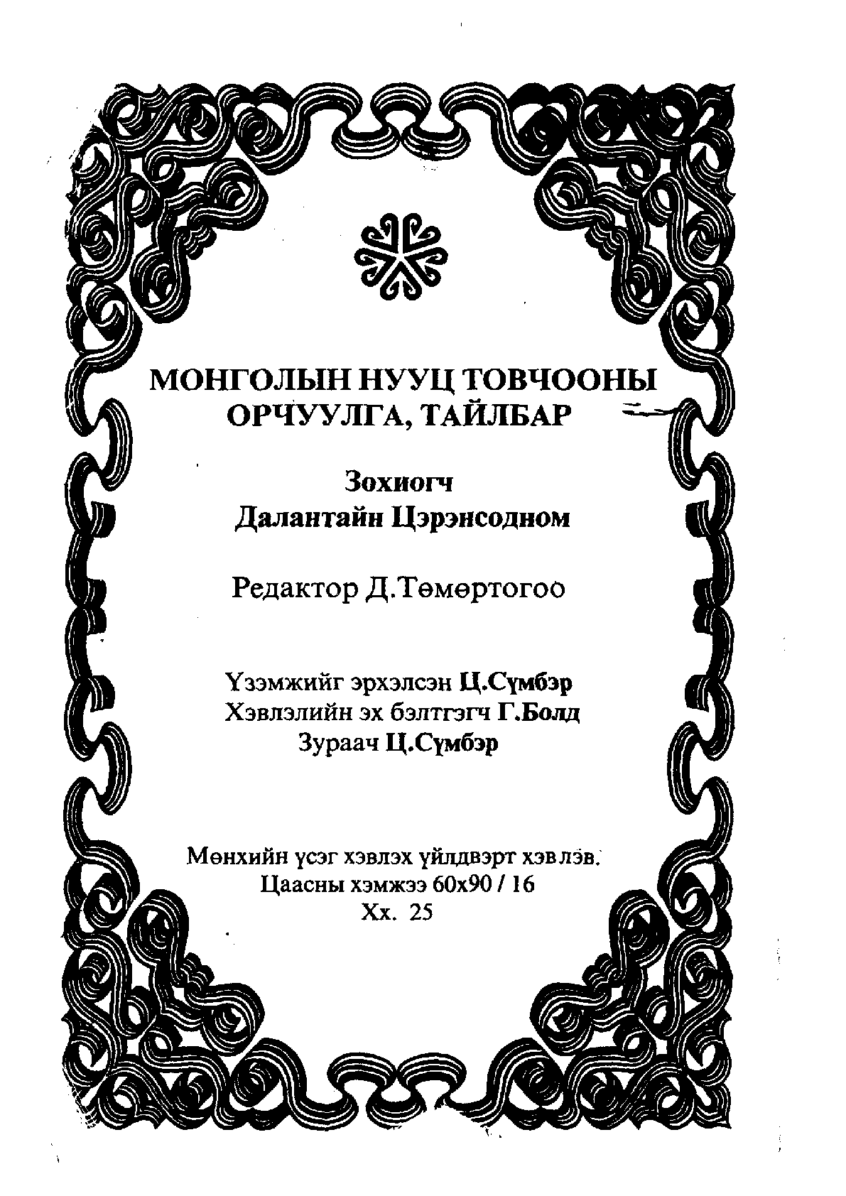 Монголын нууц товчоо [Text] : эрдэм шинжилгээний орчу улга, тайлбар / Д. Цэрэнсодном ; Шинжлэх Ухааны Академийн Хэл зохиолын хурээлэн ; редактор Д. Томортогоо... – Уланбатыр : Мөнхийн үсэг хэвлэх үйлдвэрт хэвлэв, 2000. - 386 х., чимэглэл; . – Цагаан толгойн үсгийн индекс: х. 367-376 ; Ном зүй: х. 377-385 . – [э. б.]
