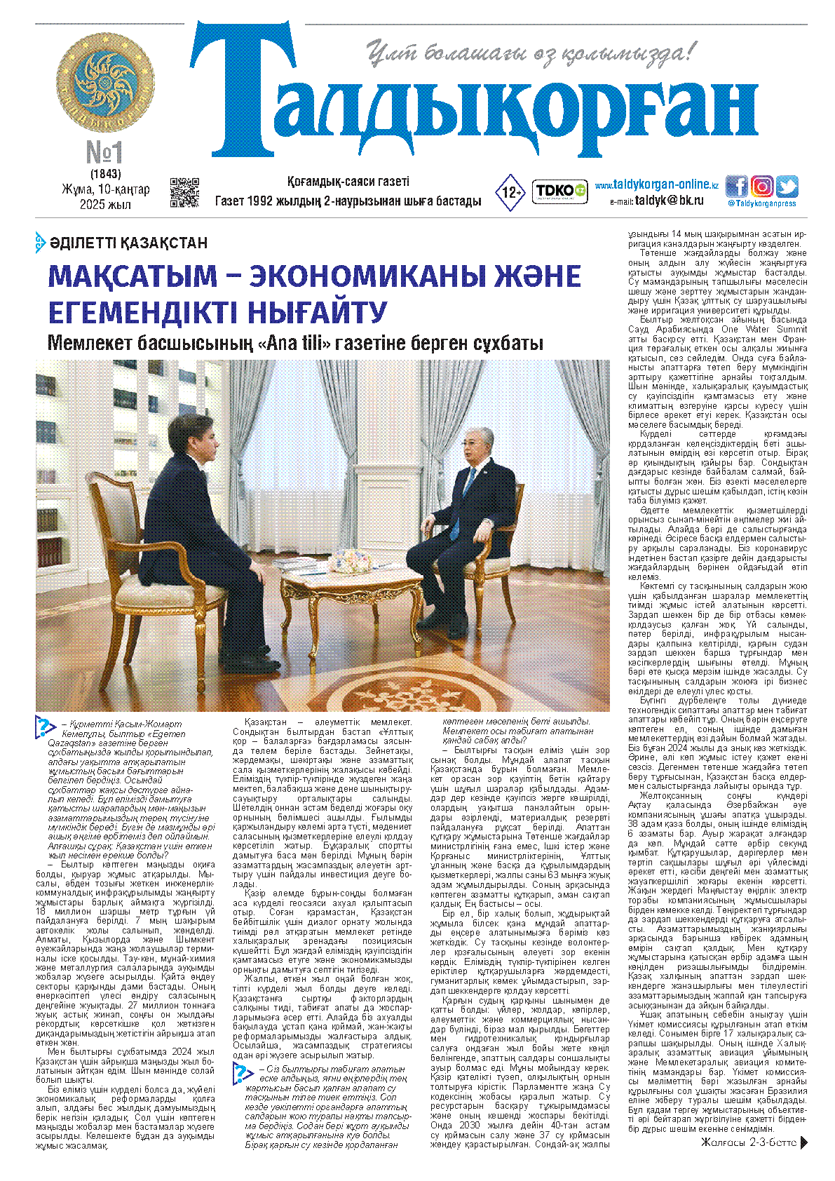 Газет мына мәселелерді қарастырған: Мемлекет басшысы «Ana tili» газетіне берген сұхбаты, 2025 жыл - Жұмысшы мамандықтарының жылы, Зейнетақы және жәрдемақы туралы мәселелерді талқылайды
