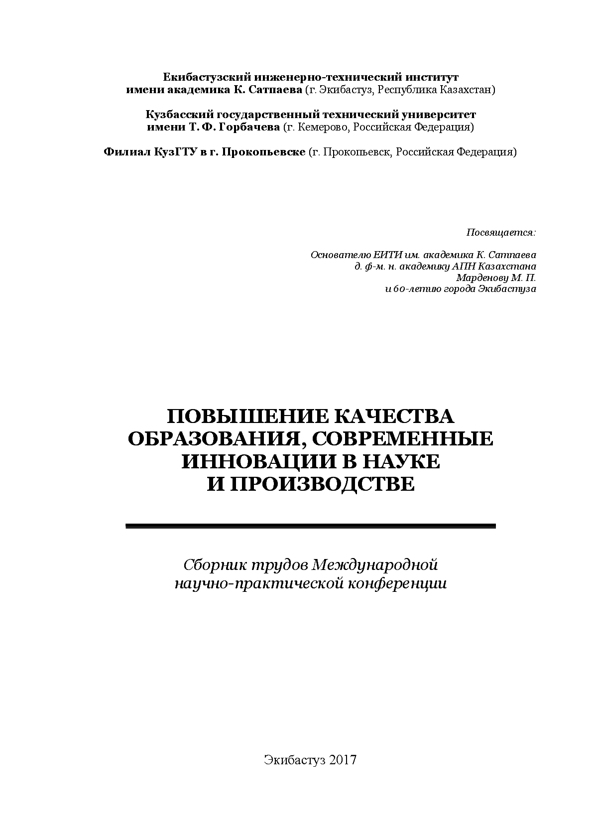Повышение качества образования, современные инновации в науке и производстве [Текст] : сборник трудов Международной научно-практической конференции / ; Екибастузский инженерно-технический институт имени академика К. Сатпаева (г. Экибастуз, Республика Казахстан) ; Кузбасский государственный технический университет имени Т. Ф. Горбачева (г. Кемерово, Российская Федерация) ; Филиал КузГТУ в г. Прокопьевске (г. Прокопьевск, Российская Федерация) ; [ответственный за выпуск: Е. Ю. Пудов]... – Экибастуз : издательтсво филиала КузГТУ в г. Прокопьевске, 2017. - 503 с. - Текст русский, казахский . – Список литературы в конце статей . – 100 экз. – ISBN 978–5–9907663–9–6