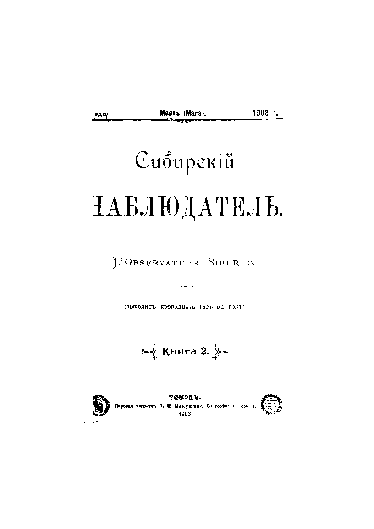 Сибирский наблюдатель [Текст]. – Омск : Паровая типо-литография П. И. Макушина, 1903. - .– [б. т.].– 12 раз в год. 1903, Книга 3 (март). - [б. т.]