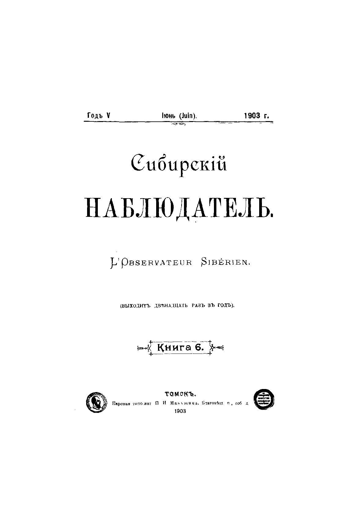 Сибирский наблюдатель [Текст]. – Омск : Паровая типо-литография П. И. Макушина, 1903. - .– [б. т.].– 12 раз в год. 1903, Книга 6 (июнь). - [б. т.]