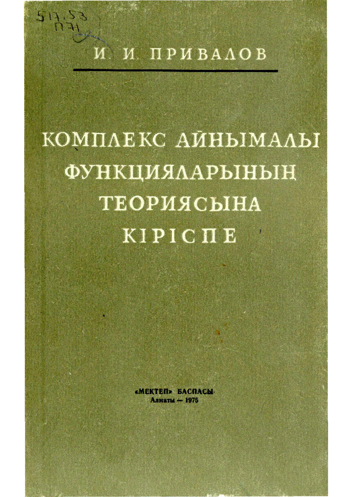 Комплекс айнымалы функцияларының теориясына кіріспе [Мәтін] : оқулық / И. И. Привалов ; [аударушылар: Ш. Еркеғұлов [т. б.]]. – 1-басылым .. – Алматы : Мектеп, 1975. - 422, [1] б., суретті; . . – 3700 дана