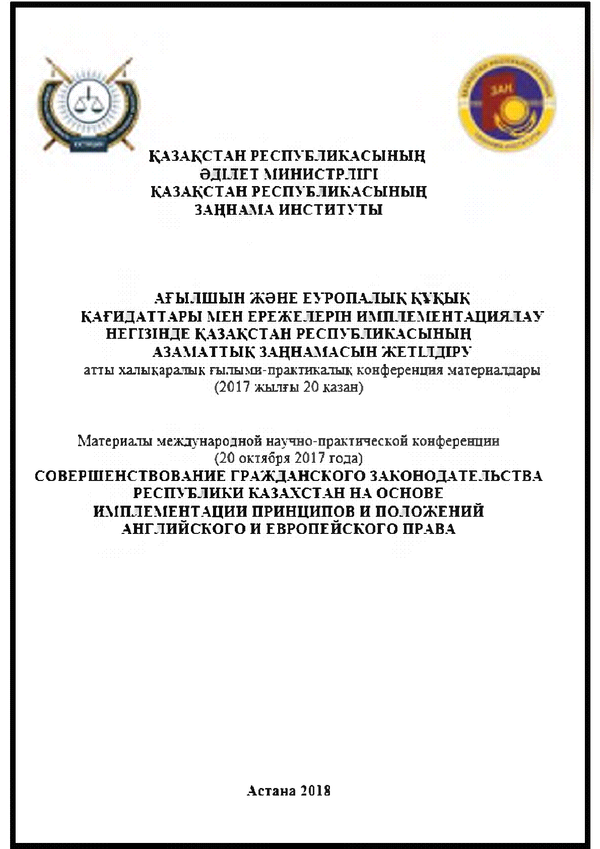 Совершенствование гражданского законодательства Республики Казахстан на основе имплементации принципов и положений английского и европейского права = Ағылшын және еуропалық құқық қағидаттары мен ережелерін имплементациялау негізінде Қазақстан Республикасының азаматтық заңнамасын жетілдіру [Текст] : материалы Международной научно-практической конференции : 2017 года 20 ноября / ; Министерство юстиции Республики Казахстан ; Институт законодательства Республики Казахстан ; редакционная коллегия: А. С. Тукиев, Ж. О. Кулжабаева, Ж. У. Тлембаева, В. Т. Конусова... – Астана : Институт законодательства Республики Казахстан, 2018. - 80 с. - Текст каз., рус., англ. . – Список использованной литературы в конце статей . – [б. т.] – ISBN 978-601-7366-38-4