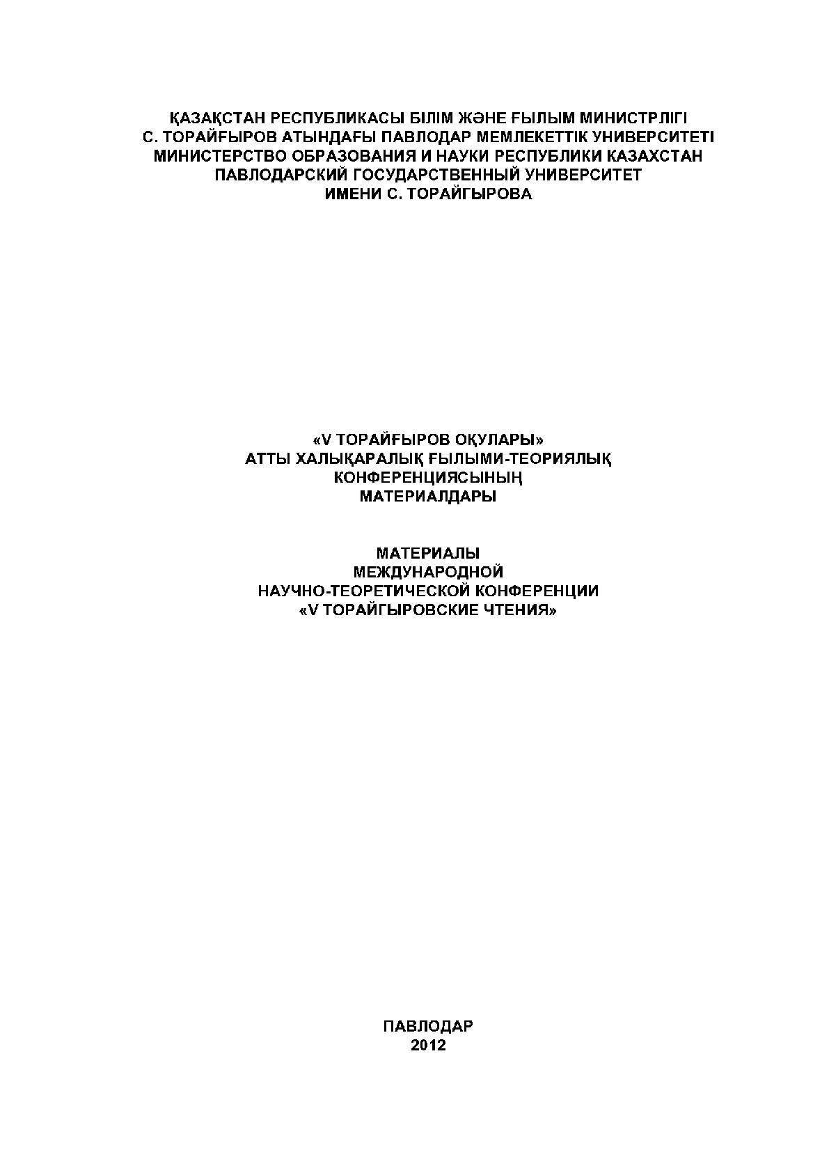 «V Торайғыров оқулары» = «V Торайгыровские чтения» [Мәтін] : халықаралық ғылыми–теориялық конференция материалдары / ; Қазақстан Республикасы Білім және ғылым министрлігі, С. Торайғыров атындағы Павлодар мемлекеттік университеті ; [редакция алқасының бас редакторы: С. М. Өмірбаев ; редакция мүшелері: А. Ф. Елмұратова [т. б.]]... – Павлодар : "Кереку" баспасы, 2012. - 359 б., суретті; - Мәтін қазақ, орыс, ағылшын тілдерінде . – Әдебиеттер тізімі мақала соңында . – 500 дана – ISBN 978-601-238-268-6
