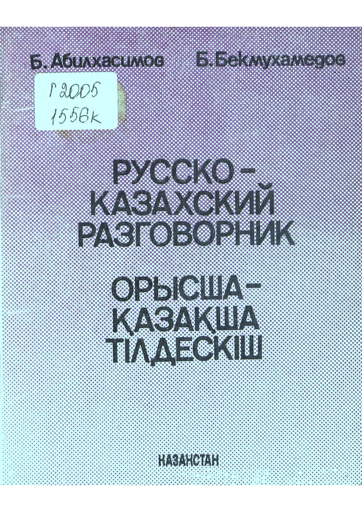 Русско-казахский разговорник = Орысша-қазақша тілдескіш [Текст] / А. Б. Абилхасимов Б. Ш. Бекмухамедов ... – Алма-Ата : Казахстан, 1989. - 158 с. - Шора Сарыбаев қоры . . – 50000 экз. – ISBN 5-615-00374-Х : 100 тг.